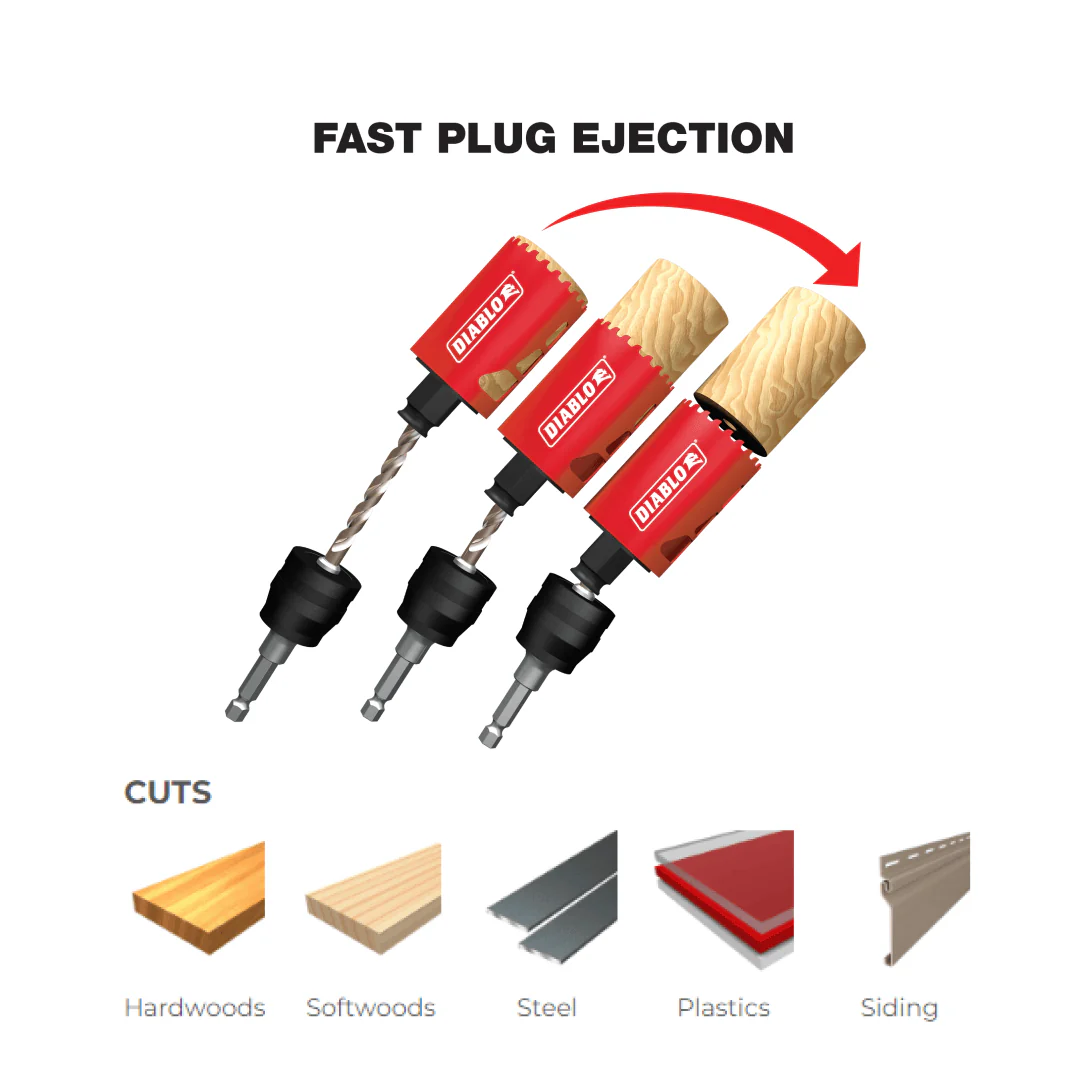 Diablo’s new, high performance hole saws deliver faster cutting performance and increased productivity. Unlike anything on the market, Diablo’s hole saw system and mandrel design simplify the attachment process for fast and efficient hole saw mounting. These radical new hole saws provide ultimate cutting length to bore deeper holes in a single pass, tool-free plug ejection and Variable Tooth Design for faster cuts.